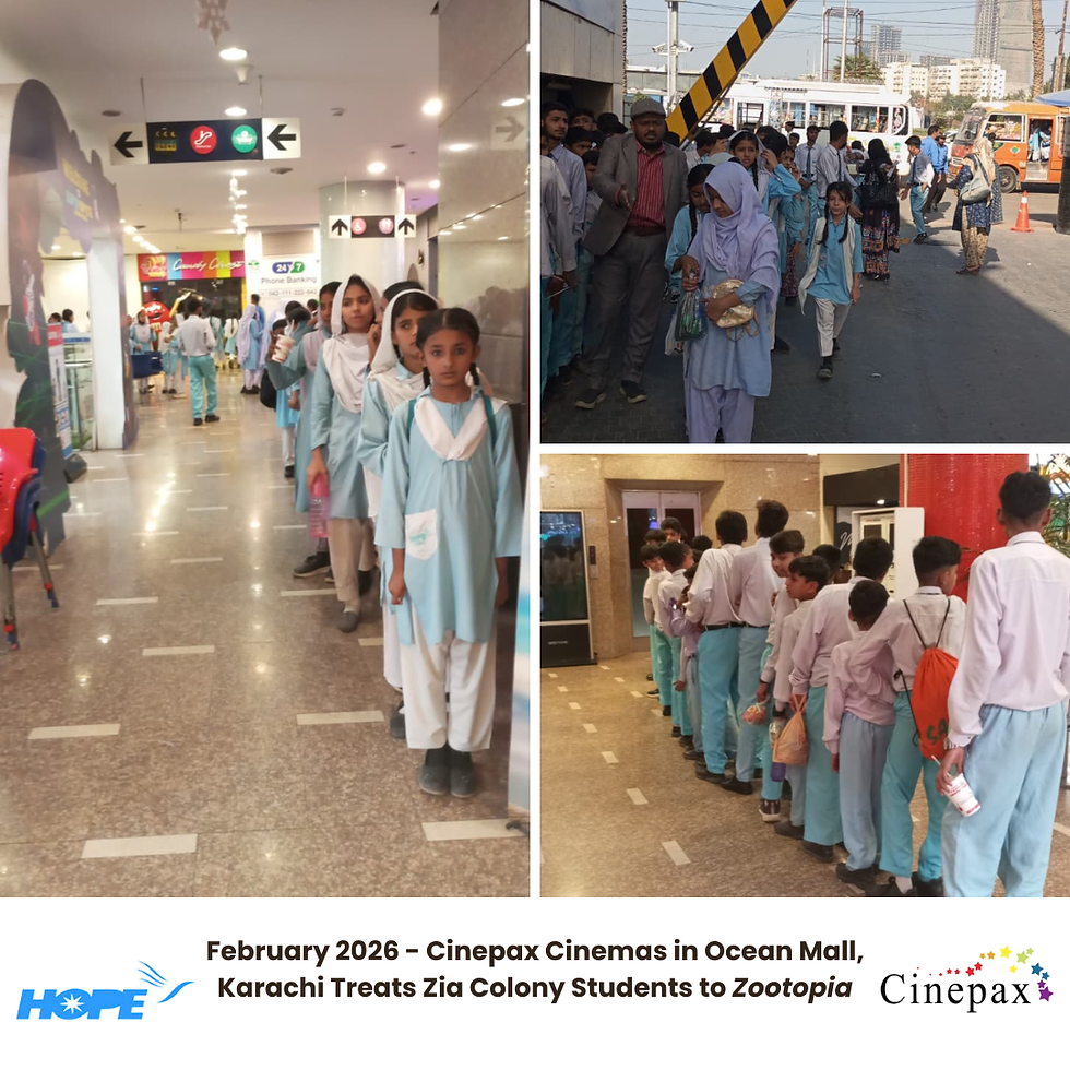 On February 14, 2026, 200 children 🧒🏻 from HOPE's Zia Colony Formal School 🏫 in Karachi, Pakistan 🇵🇰 were treated to a screening of Zootopia in Urdu at Ocean Mall, Karachi, courtesy of Cinepax Cinemas 🎥. Since HOPE caters to those living below the poverty line ❤️🩹, for the vast majority of these children, it was their first time ever seeing a movie 🎬 in a theater, and for many others, the first time ever inside a shopping mall 🛍️.